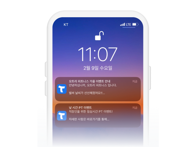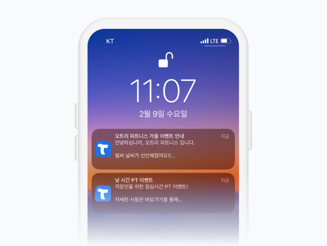 앱 알림으로 이벤트, 공지 내용을 무료로 보내보세요. 월 10~50만원이 들던 문자 비용을 아낄 수 있습니다.또한 회원권 만료 전에 결제 유도를 위한 자동 메시지 발송 기능도 있습니다.